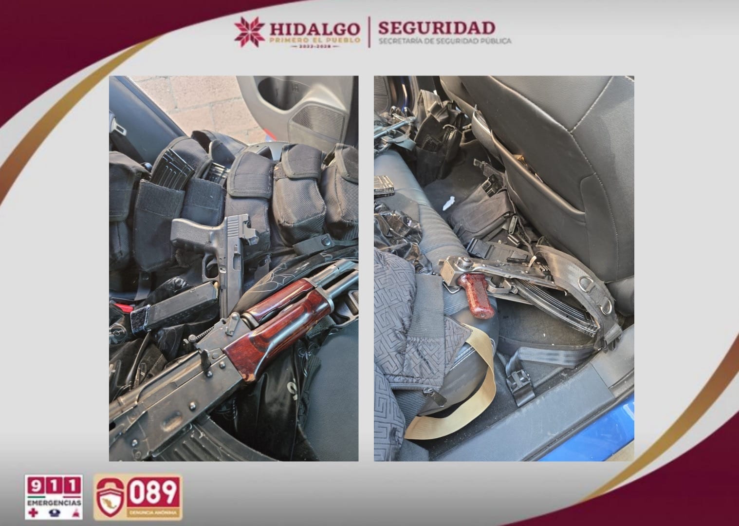 Durante esta intervención, fueron detenidos dos sujetos que viajaban a bordo de una camioneta Explorer color blanco, ambos originarios del estado de Campeche. En el lugar se aseguraron tres armas largas, conocidas como cuernos de chivo, así como un arma corta, todas abastecidas, además de chalecos tácticos. Uno de los detenidos resultó lesionado y fue trasladado a un hospital para su atención médica.