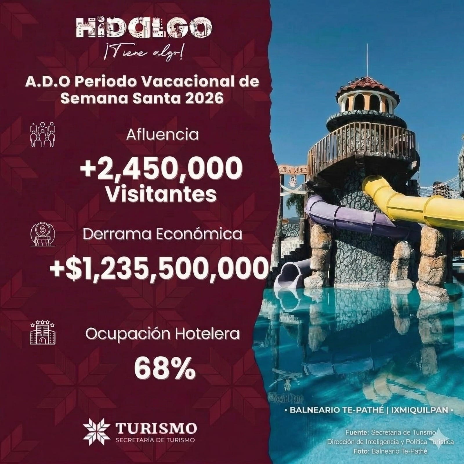Hidalgo registró una afluencia superior a 2 millones 450 mil visitantes durante el periodo vacacional de Semana Santa 2026, consolidándose como uno de los destinos preferidos del centro del país.