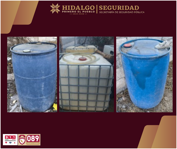 Durante estos trabajos se logró el aseguramiento de aproximadamente 530 litros de combustible, distribuidos en 13 contenedores plásticos tipo bidón, así como 41 contenedores vacíos presuntamente utilizados para su almacenamiento. En el sitio también fueron localizados 10 metros de manguera, comúnmente empleada para la extracción y manejo ilegal de combustible.