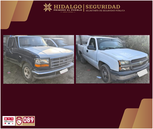 Derivado de la intervención, fueron decomisadas dos camionetas que presentaban irregularidades, una de ellas con reporte de robo vigente por placa, mientras