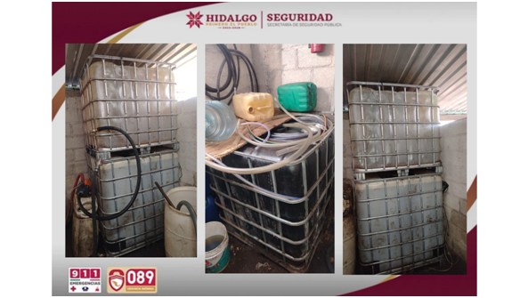 La Secretaría de Seguridad Pública de Hidalgo (SSPH) aseguró un predio utilizado como punto de almacenamiento y venta ilegal de hidrocarburo en la localidad de Texcaltitla, municipio de Singuilucan.