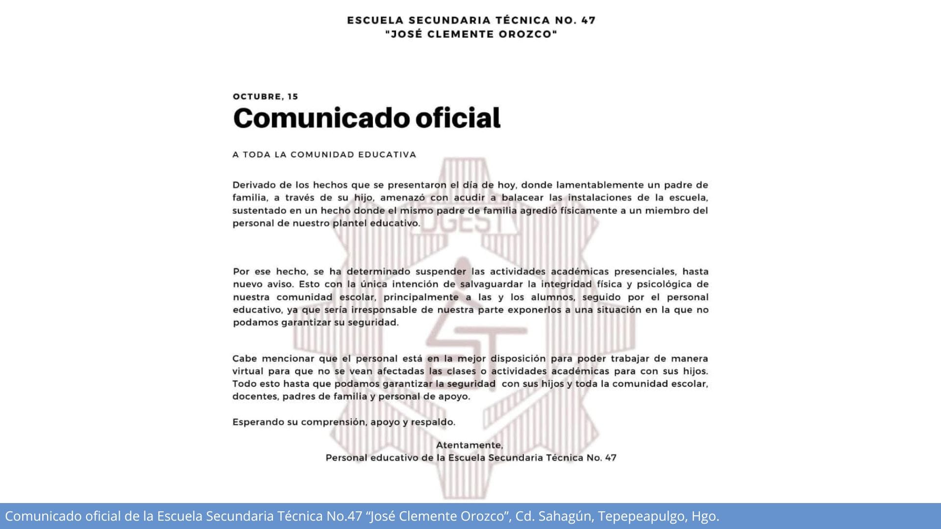 Tepeapulco, Hgo. - La Escuela Secundaria Técnica No. 47 "José Clemente Orozco", ubicada en Ciudad Sahagún, municipio de Tepeapulco, suspendió temporalmente sus actividades presenciales luego de que un padre de familia presuntamente amenazara con ingresar armado al plantel y disparar dentro de las instalaciones.